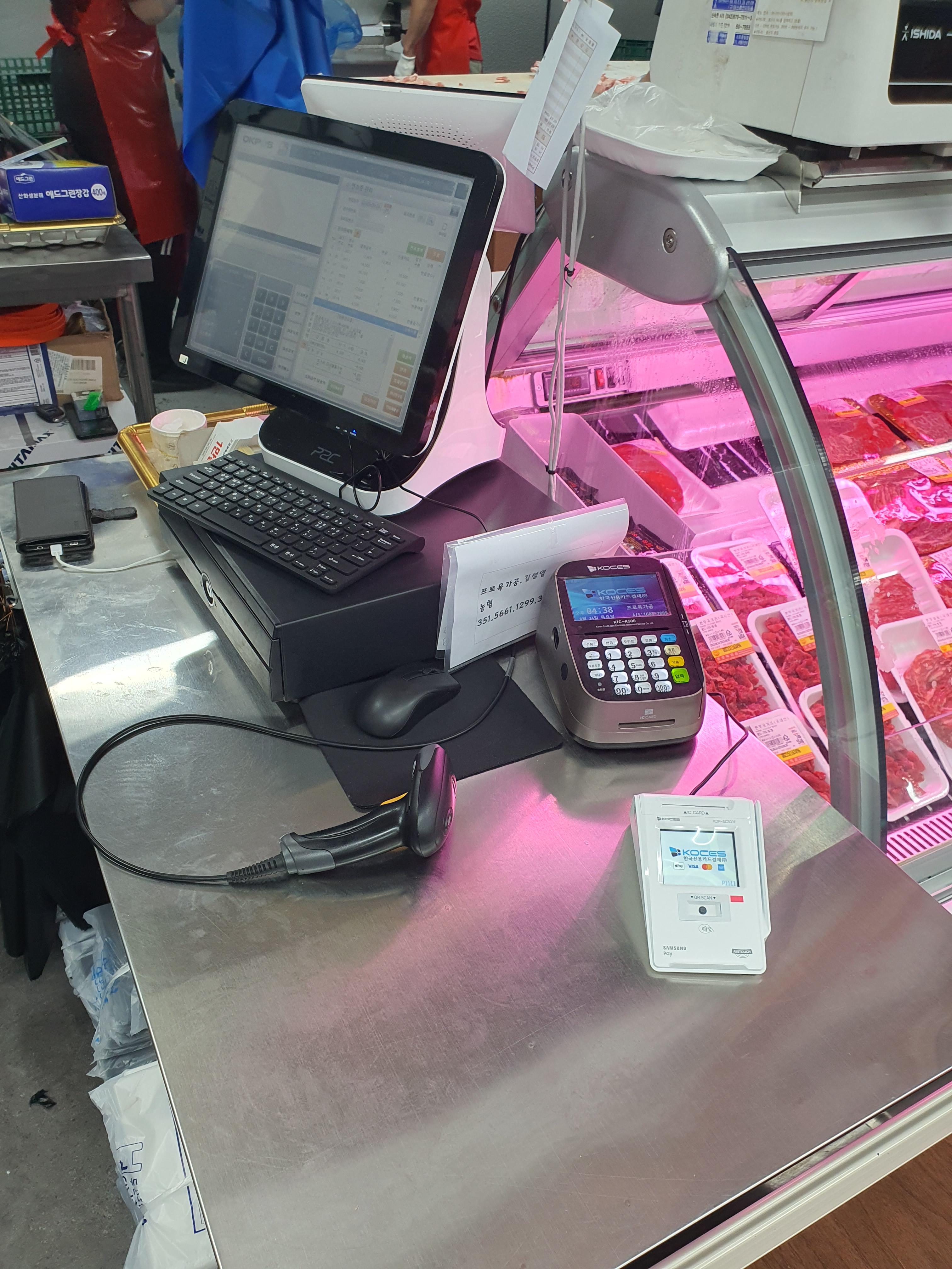 정육점에서 고객관리와 듀얼고객모니터 애플페이 삼겅페이 카카오페이 제로페이 가능하면서 고객이 직접 결제 카드를 넣을수 꽂을수있는 서명패드로 설치해드렸습니다. 따로 백업용 단말기 놓을곳이없어서  카드단말기로 프린터겸용으로 세팅해드렸으며 안정적으로 잘사용하고계십니다. 고기도 맛있어서 매장도 추천드립니다~