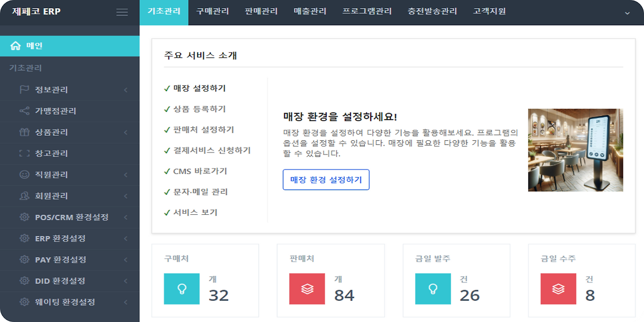 제페코에서 개발한 자사 ERP 시스템과 포스 프로그램을 이용하여
